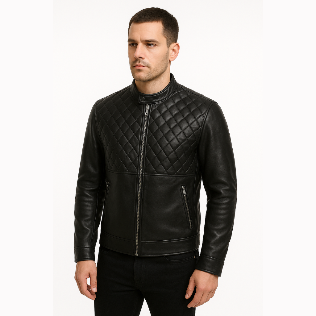 Classic racer with racing-style quilting. Full-grain cowhide (0.9-1.0mm), diamond quilted chest/shoulders, YKK zipper, band collar, slim fit. Vintage racing aesthetic. Lambskin upgrade available. FREE SHIPPING over $150. 14-day money-back guarantee.